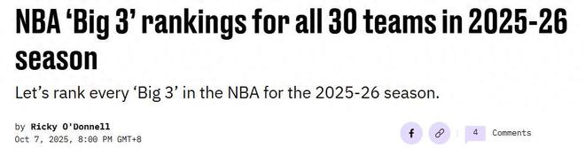 火箭队屈居第6名!在季前赛开打新赛季到来之际,美媒《sbnation》公布出新赛季3巨头排名,其中快船第10,勇士第9,湖人队则高居第3。