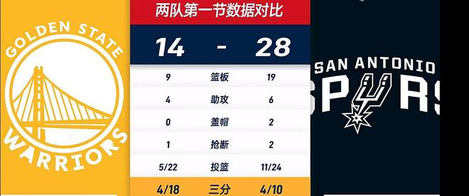 回到比赛库里前一次出手改成了3分勇士加一分,卡斯尔三分命中,科内特防守吃到犯规勇士继续进攻库里三分不中,卡斯尔超远三分也没有,希尔德三分依旧铁这段时间篮筐都被打歪了。瓦塞尔三分不中卡斯尔飞身补中比分来到19-11,4分57秒科尔喊出暂停!比赛继续库里突分霍福德三分命中,卡斯尔还是点库里中距离拔中,希尔德乱打被帽卡斯尔反击上篮再中分差9分了,库明加、库里三分连续铁三分手感太差了。波杰姆斯基兜出来三分还是不中,2分39秒巴特勒换下库里,文班亚马重新回到场上马刺摆出双塔,库明加去防文班亚马后者中距离打铁,霍福德三分还是不中,凯尔登溜底线反篮上中25-14马刺领先来到11分,文班分球尚帕尼三分有了,巴特勒三分不中福克斯最后一攻也没打成,首节战罢勇士14-28落后14分之多,外线手感太差了首节狂丢18三分仅仅只命中4球!