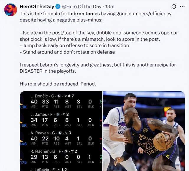 美媒网站HerofTheDay第一时间分享了“詹姆斯数据好看,但正负值最差”的原因: