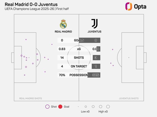 本场比赛,皇家马德里在上半场完成14次射门,4次射正,尤文图斯3次射门1次射正,前45分钟比分为0-0。