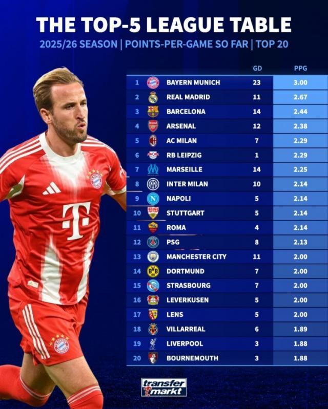 《转会市场》统计了本赛季五大联赛球队的场均拿分情况,拜仁、皇马、巴萨、阿森纳分列前四。本赛季五大联赛场均拿分榜(及净胜球数):