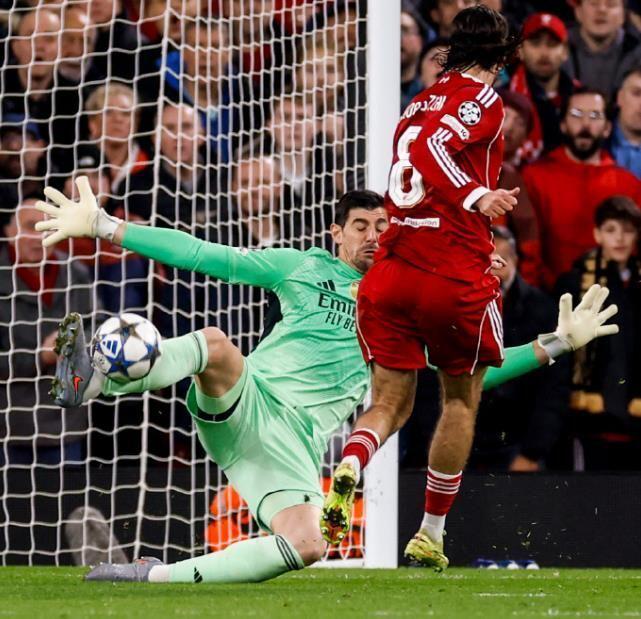 比赛从一开始就进入了利物浦熟悉的快节奏。上半场,利物浦中场索博斯洛伊便成为皇马防线的噩梦。他先是机敏包抄抢点,被库尔图瓦反应神速用脚挡出;随后又一脚势大力沉的远射,再次被这位比利时门神飞身化解。整个上半场,利物浦的进攻一浪高过一浪,而站在他们面前的,仿佛是一堵无法逾越的高墙。
